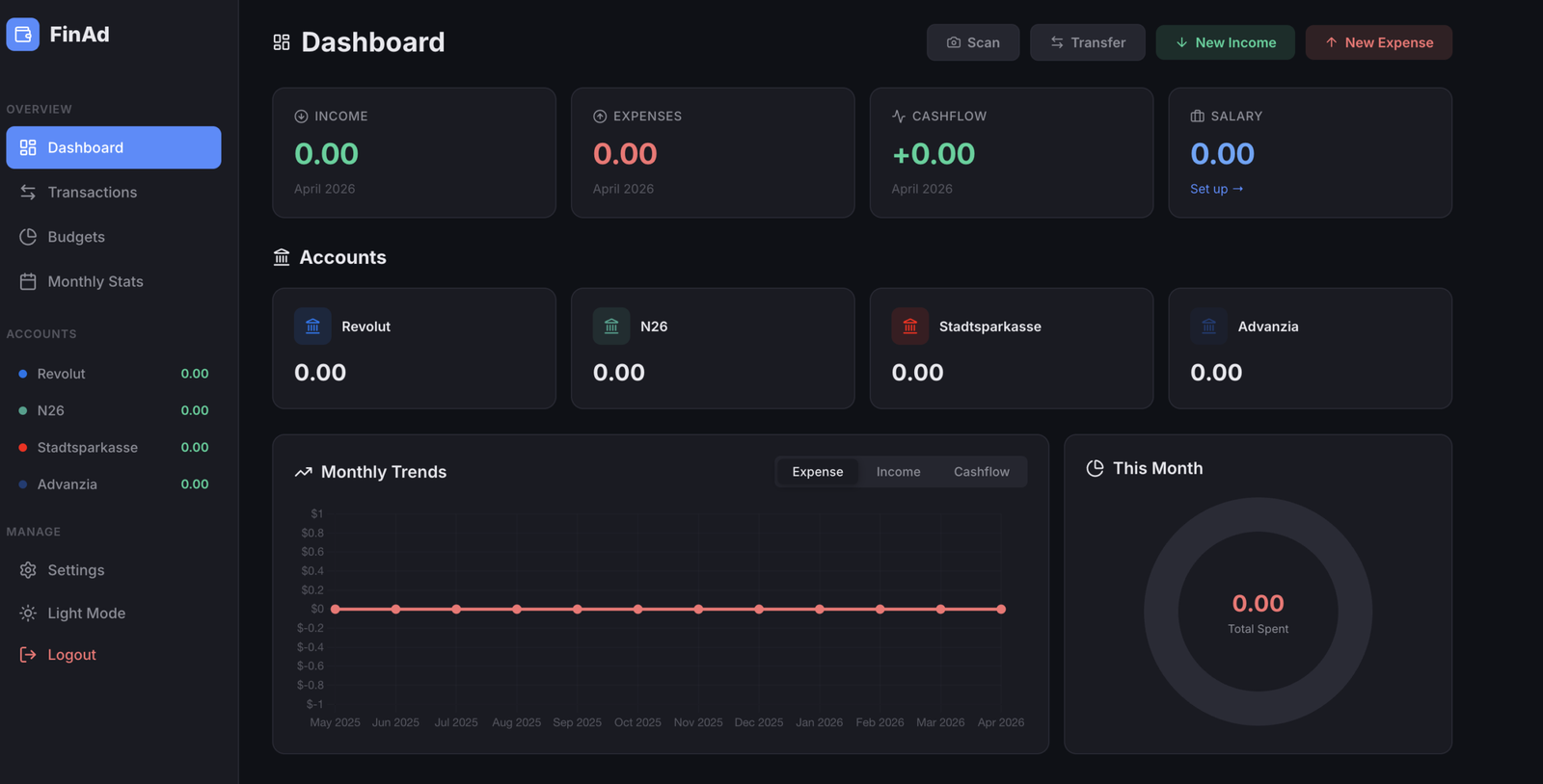 FinAd is a self-hosted personal finance manager with AI-powered receipt scanning. Track accounts, transactions, budgets, and net worth — all data stays on your machine. Snap a photo of any receipt and Claude Vision extracts the amount, date, and category automatically. Runs in Docker with a single command.