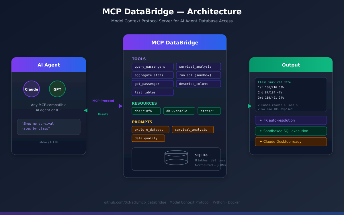 The server exposes 7 tools, 3 resources, and 3 prompts over a normalized SQLite database (8 tables, 891 records). It supports both stdio transport for local Claude Desktop usage and HTTP transport for remote Docker deployments. The MCP Inspector provides an interactive web UI for testing every tool and resource before connecting an agent.