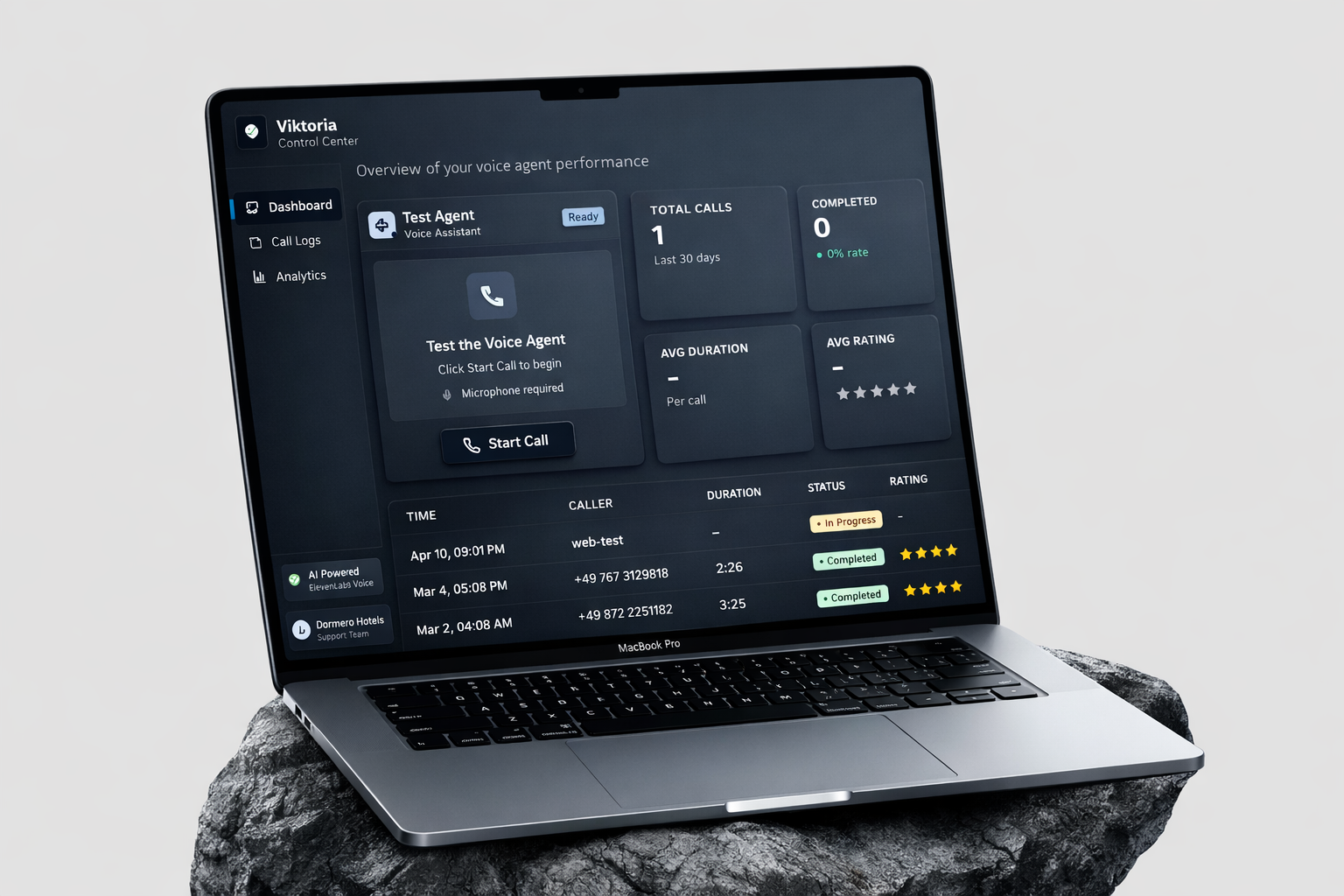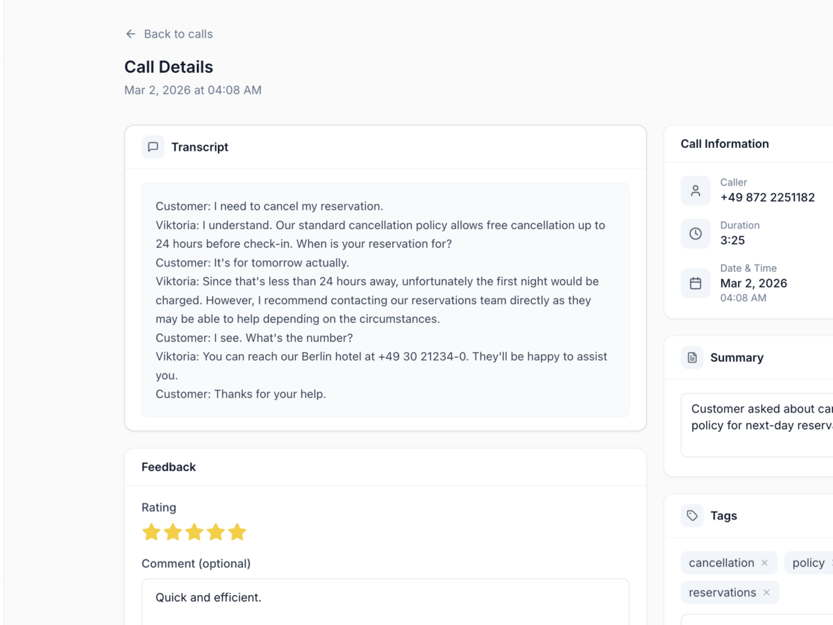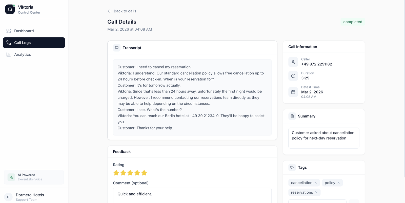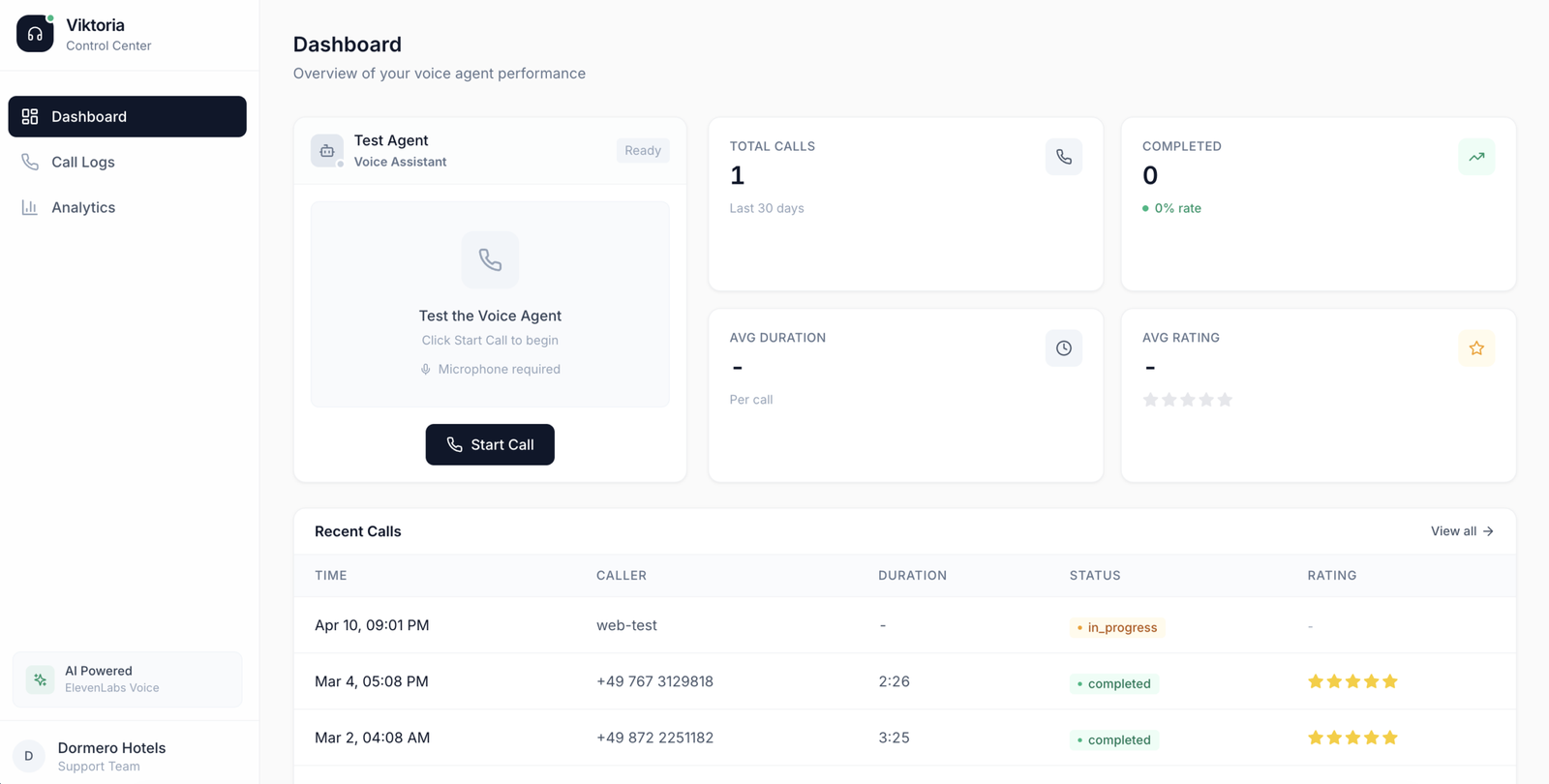 Viktoria is an AI-powered voice agent that handles Tier-1 customer inquiries for Dormero Hotels. Guests call in and speak naturally — the system understands their question, searches a semantic knowledge base, and responds in real-time via voice. A Control Center dashboard lets hotel staff monitor every call, track feedback, and manage the knowledge base.