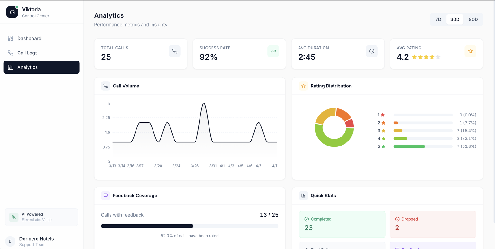 • Call analytics dashboard — volume trends, duration, resolution rates